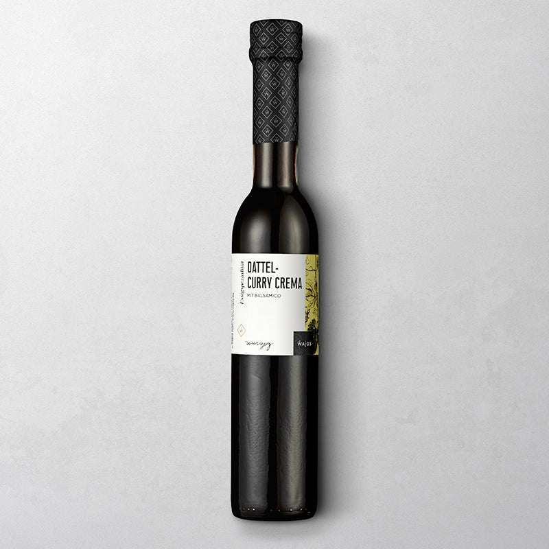 Entdecken Sie die würzige Wajos Dattel-Curry Crema – mit Balsamico, eine fein abgestimmte Kombination aus Dattelsirup und hochwertigem Aceto Balsamico di Modena (g.g.A). Diese Crema di Balsamico mit einem angenehm milden Säuregehalt von 3 % eignet sich perfekt als Balsamico Dressing für Salate oder als verfeinernde Zutat für eine Vielzahl von Gerichten. Vegan hergestellt, bietet sie eine kulinarische Bereicherung für jeden, der das exquisite Aroma von Balsamico schätzt. In einer praktischen 250ml-Flasche erhältlich, ist diese Balsamico Crema im Vergleich zu herkömmlichem Essig, Balsamico Essig oder Fruchtessig ein unverzichtbares Element in Ihrer Küche. Gönnen Sie sich den Genuss der Wajos Dattel-Curry Crema – mit Balsamico und verwöhnen Sie Ihre Sinne.