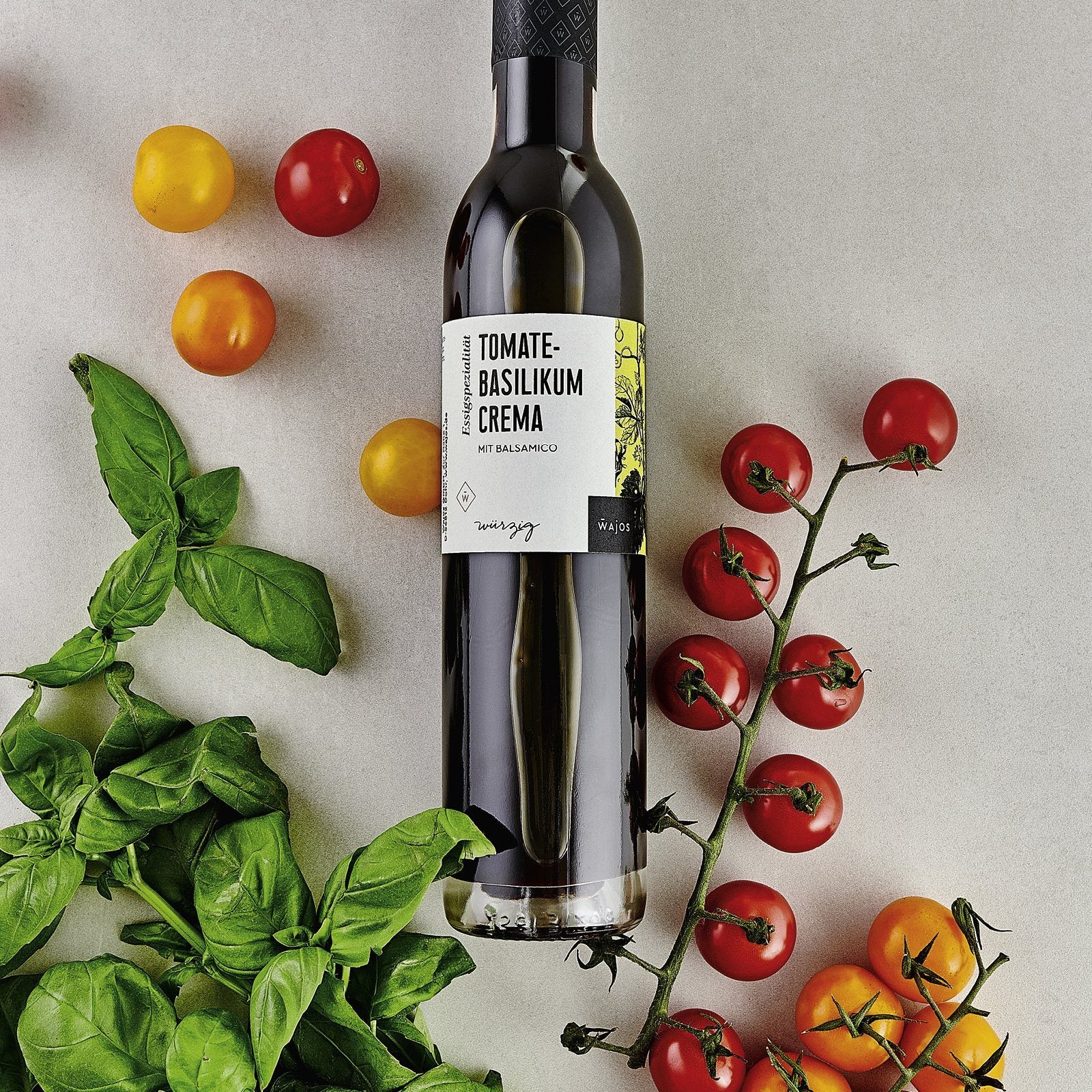 40% Aceto Balsamico di Modena (g.g.A.) (Weinessig, Traubenmostkonzentrat), Zucker, Glukosesirup, 5% Tomatensaft aus Konzentrat, Branntweinessig, Karamellsirup, Wasser, natürliches Aroma, natürliches Basilikum Aroma, Antioxidationsmittel: KALIUMMETABISULFIT.