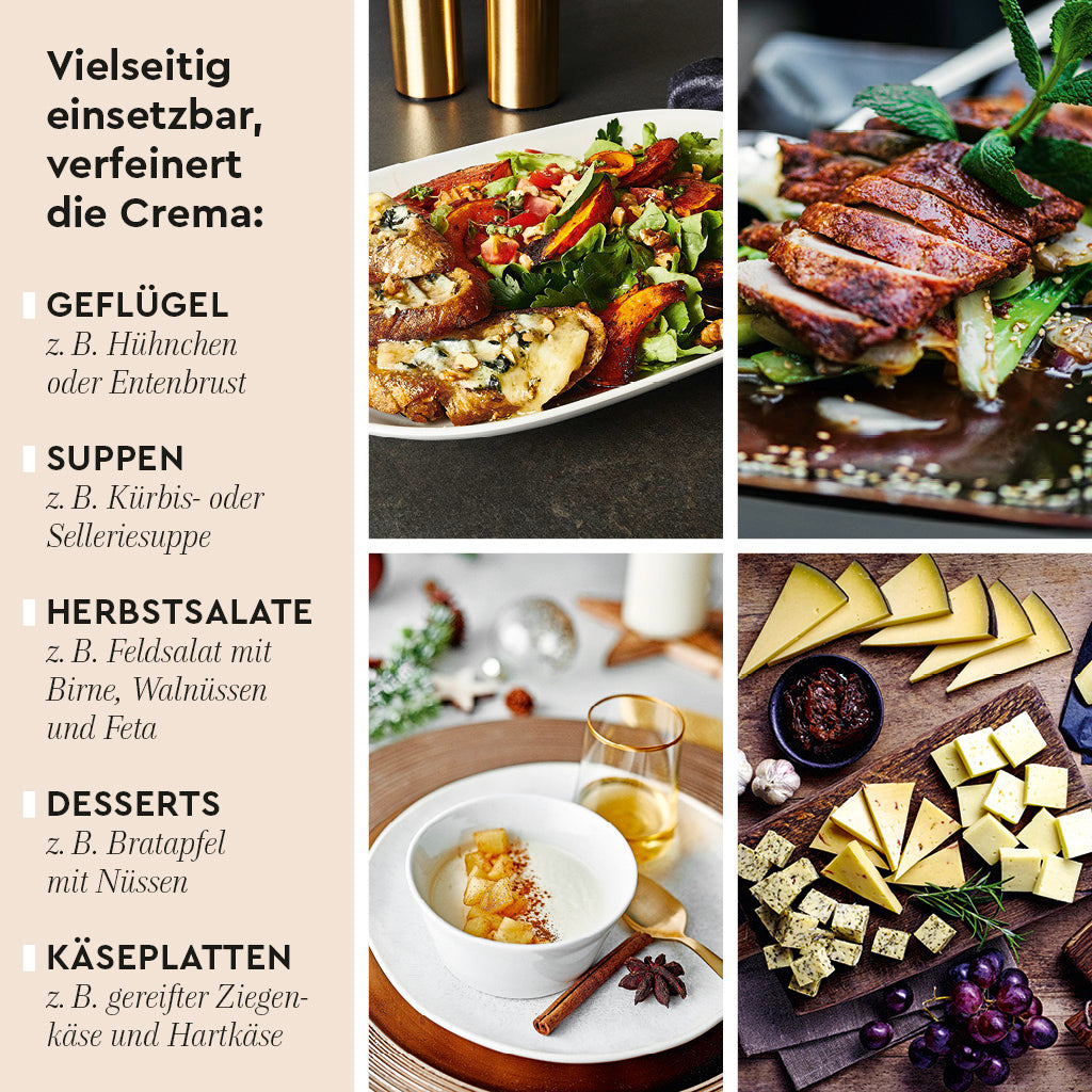 Diese Crema überzeugt mit dem fruchtigen Geschmack von reifen Birnen und feinen Anklängen von Vanille. Abgerundet mit cremigem Balsamico verfeinert sie süße Desserts ebenso wie herzhafte Gerichte, schmeckt wunderbar zu herbstlichen Salaten und ist der fruchtige Begleiter gemischter Käseplatten.