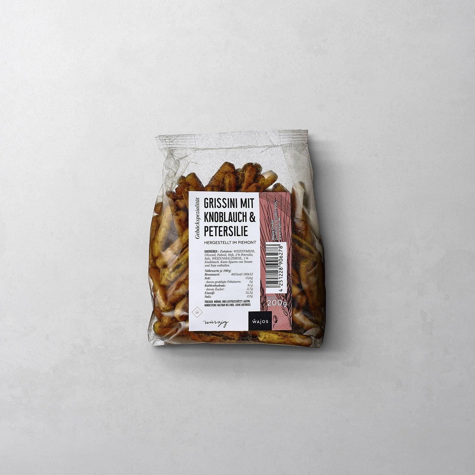 WEIZENMEHL, Olivenöl, Palmöl, Hefe, 2% Petersilie, Salz, WEIZENMALZMEHL, 1% Knoblauch. Kann Spuren von Sesam enthalten.