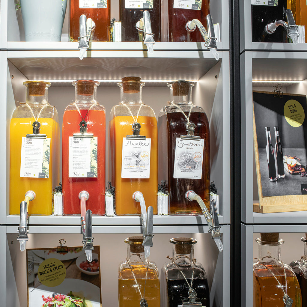 Weniger Verpackungen, weniger Müll: Nach diesem Konzept werden Spezialitäten aus großen Amphoren nach Wunsch in Glasflaschen im Geschäft abgefüllt und können später auch wieder neu befüllt werden. Probieren Sie unsere Essig- und Ölspezialitäten, Liköre & Spirituosen sowie Whisky und Rum in unseren Stores.