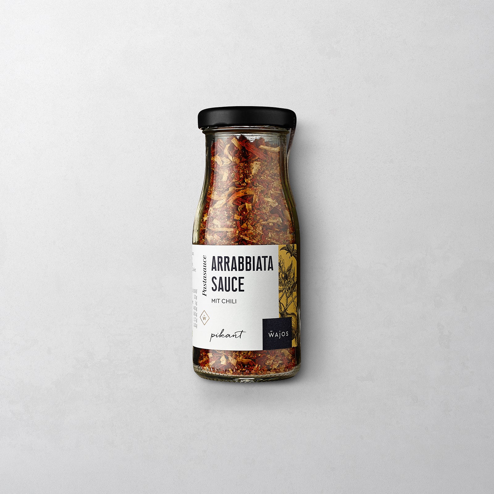 Die schnelle Arrabbiata Sauce für Ihre Pasta ist mit der Gewürzmischung im Handumdrehen selbstgemacht: Glasinhalt mit 200 ml Wasser in einer Pfanne köcheln, 150 ml Olivenöl dazugeben und erhitzen, 500g gekochte Pasta dazugeben, fertig.