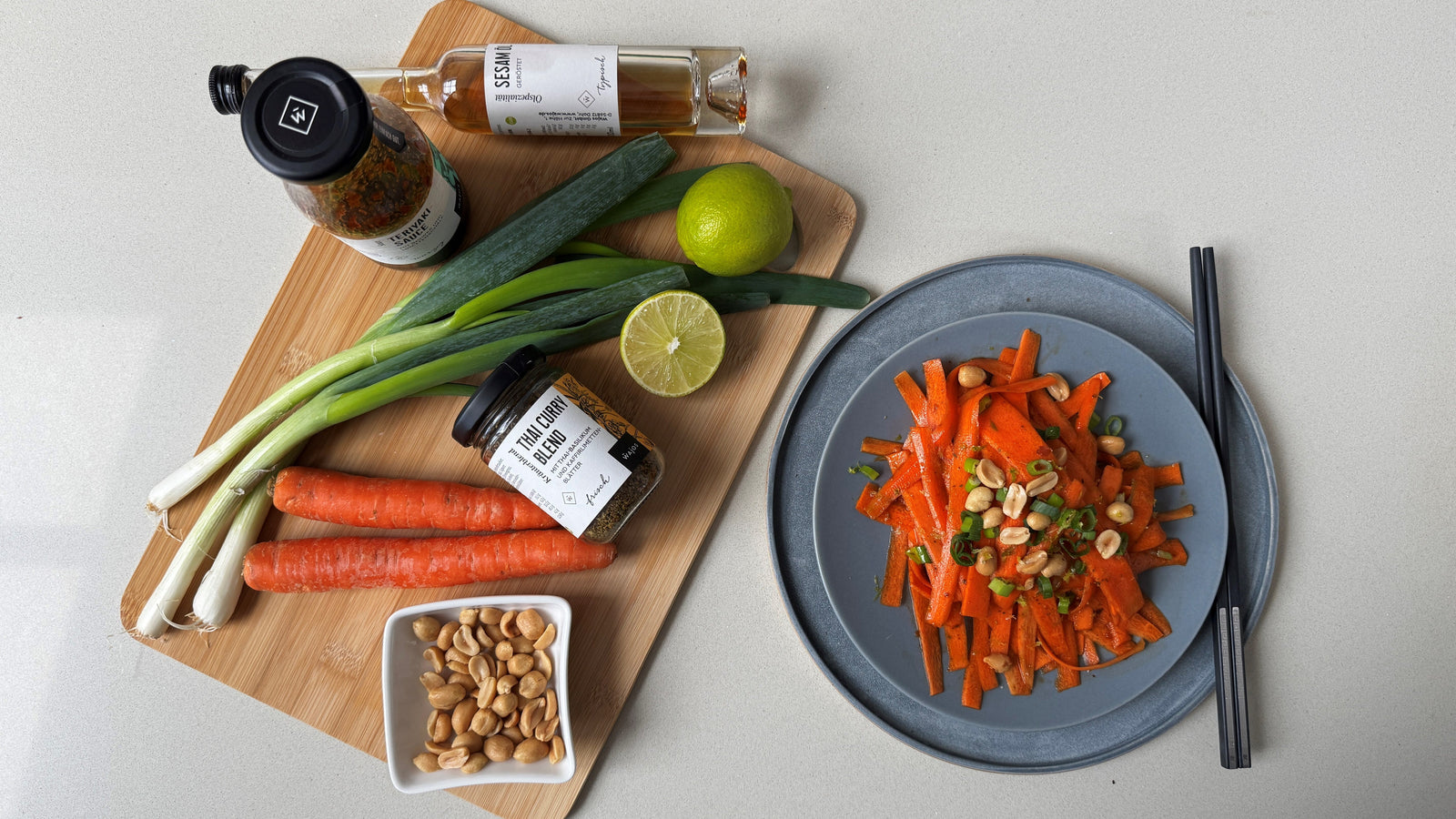 Zucker, Sojasauce (Wasser, SOJABOHNEN, Salz, Essig), Essig (SULFITE), SENFSAAT, Wasser, 3,5% Ingwer, Tomatenpulver, Zuckersirup, Gewürze, 1,2% Limettenschale, Salz, Glukose-Fruktosesirup, natürliches Aroma, Rapsöl, brauner Zucker, Kräuter, Antioxidationsmittel (Ascorbinsäure), Gewürzextrakt.