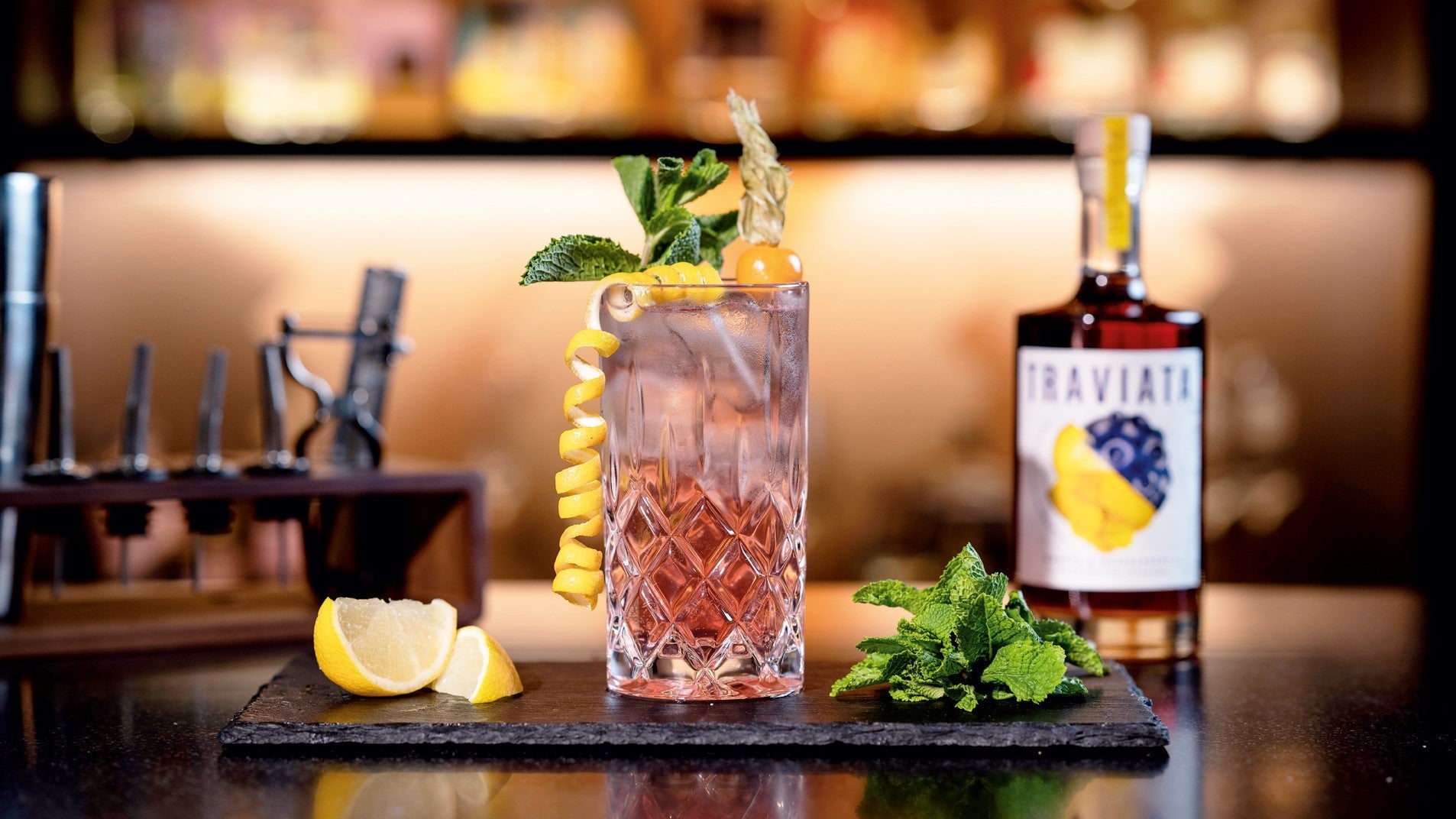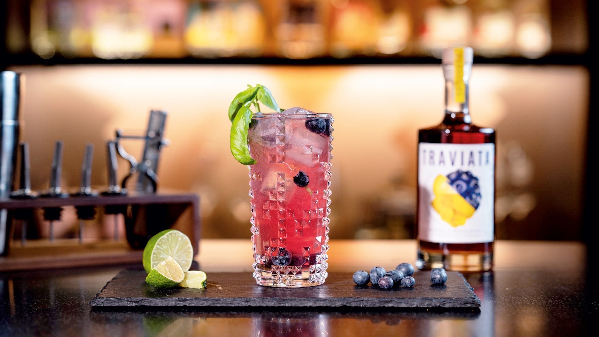 Crushed Ice, 5 Trauben - halbiert, Heidelbeeren, 4 cl Traviata -Grappa & Heidelbeere, Soda/Tonic. Zubereitung: Das Glas mit Crushed Ice, Trauben und Heidelbeeren befüllen, Traviata dazugeben, umrühren und schließlich mit Sodawasser auffüllen.